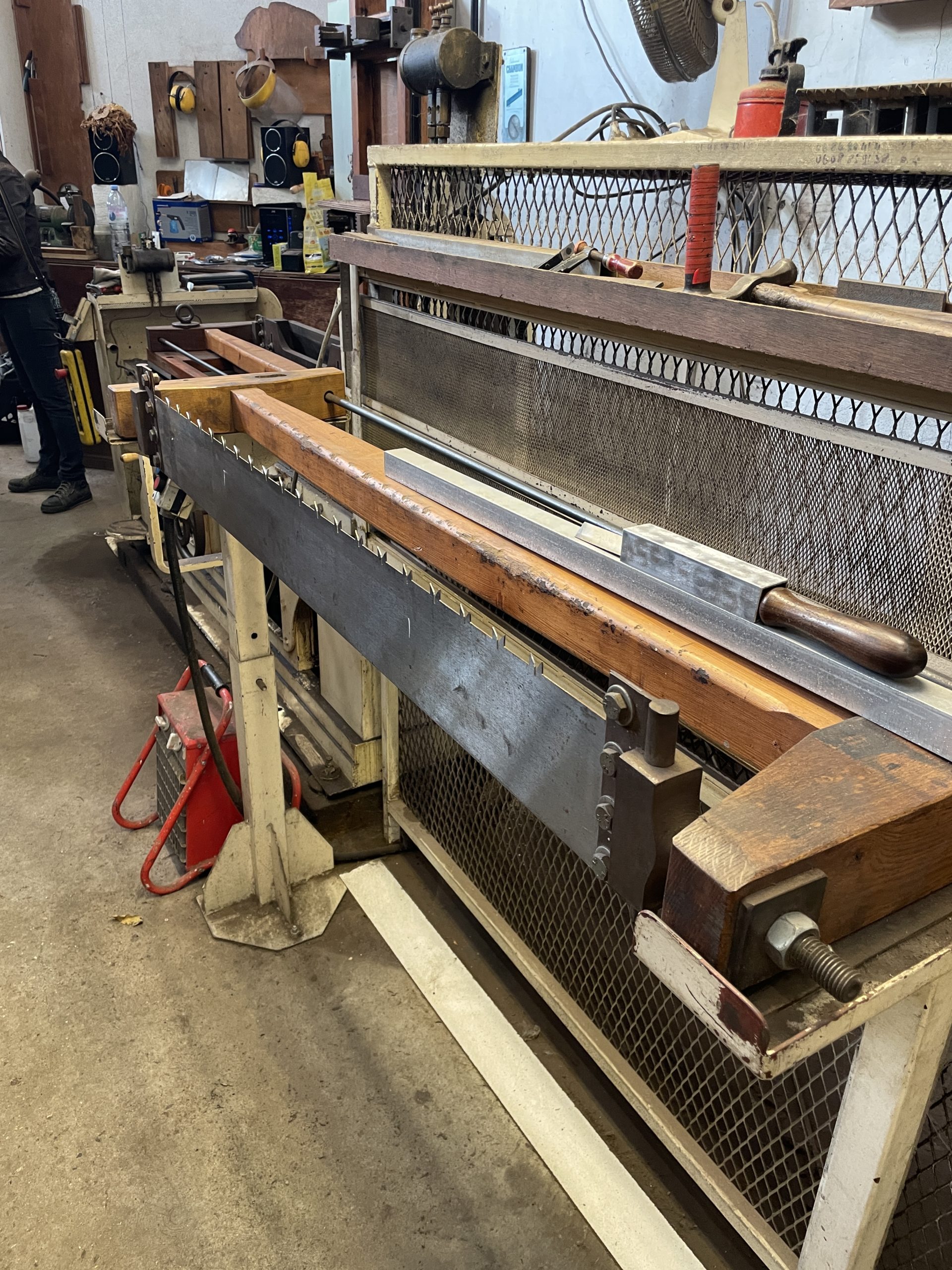 Autrefois, l’entreprise employait une quarantaine de personnes, avec de grandes machines industrielles capables de trancher le bois à grande échelle. Puis les temps ont changé. Les années 70 ont marqué la fin de cette époque : les trancheuses et dérouleuses ont disparu, l’usine s’est éteinte. Mais le bois est resté. Dans les années 1990, deux scies au bois montant ont été rachetées, et avec elles, l’atelier a retrouvé son âme.