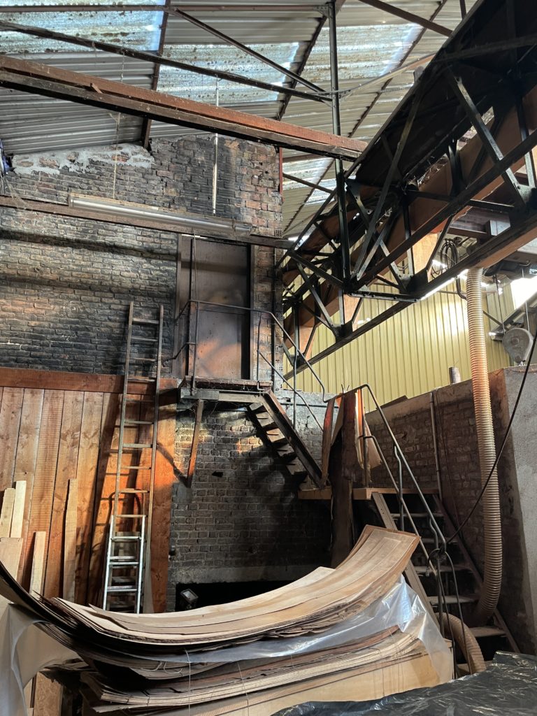 Frédéric George incarne la quatrième génération à faire vivre cette entreprise familiale. Son arrière-grand-père avait fondé les établissements George en 1920, à l’époque où l’industrie du bois de placage en France était florissante. Le lieu n’a jamais bougé. C’est la même adresse, le même souffle, depuis plus de cent ans.