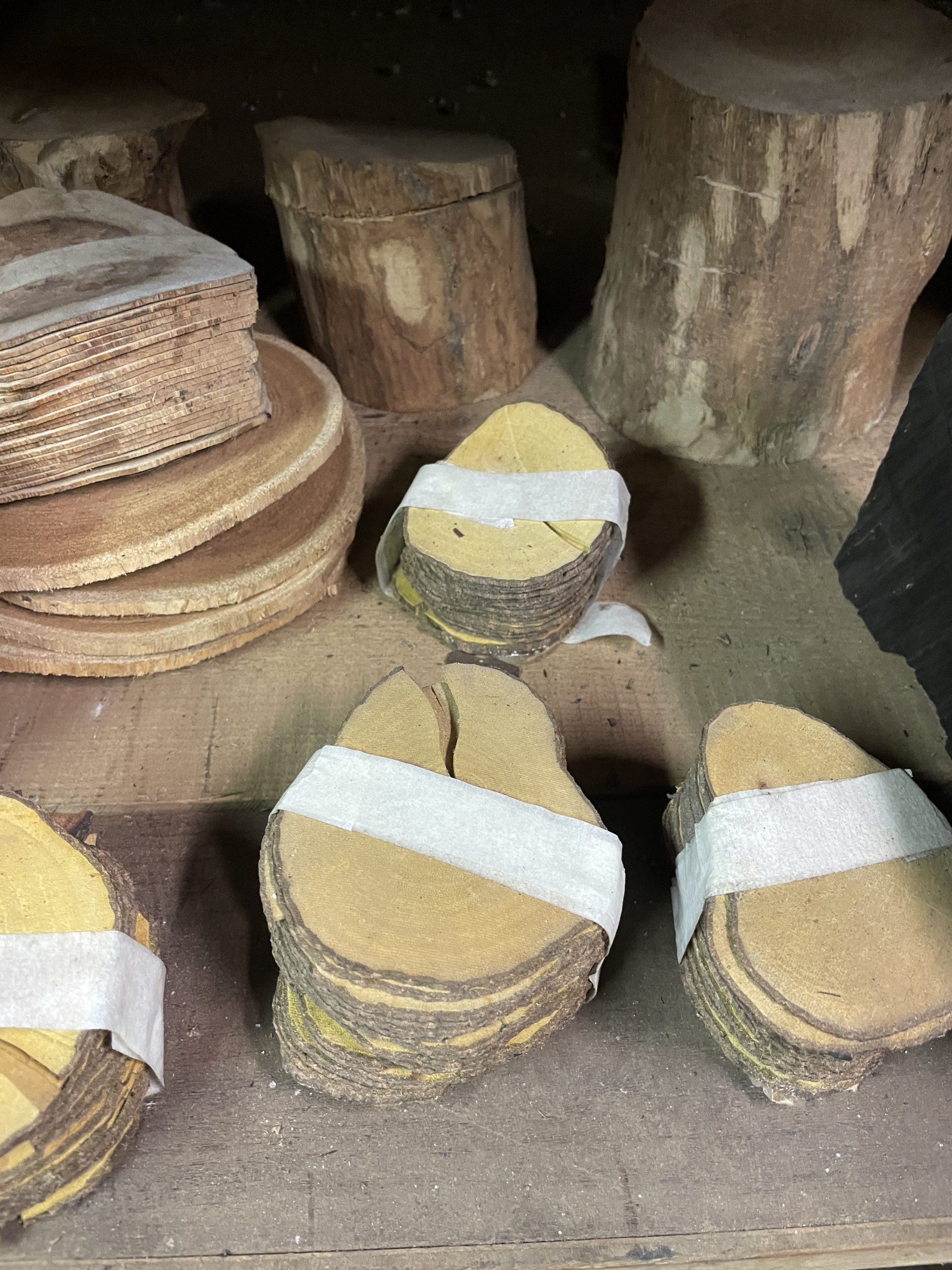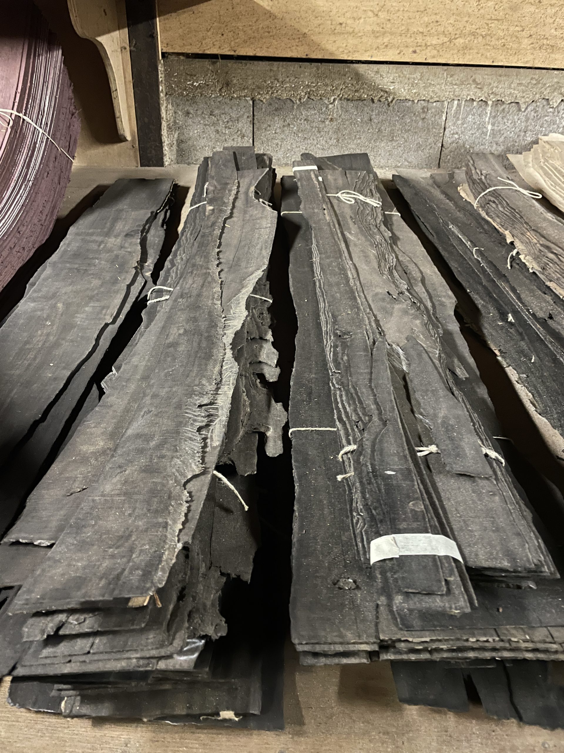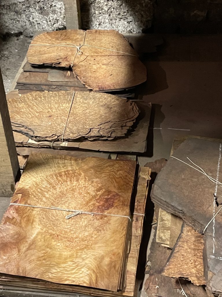 Dans la cave, les placages reposent comme des vins précieux. Ici, température et humidité sont stables toute l’année, garantissant la conservation de planches parfois uniques.