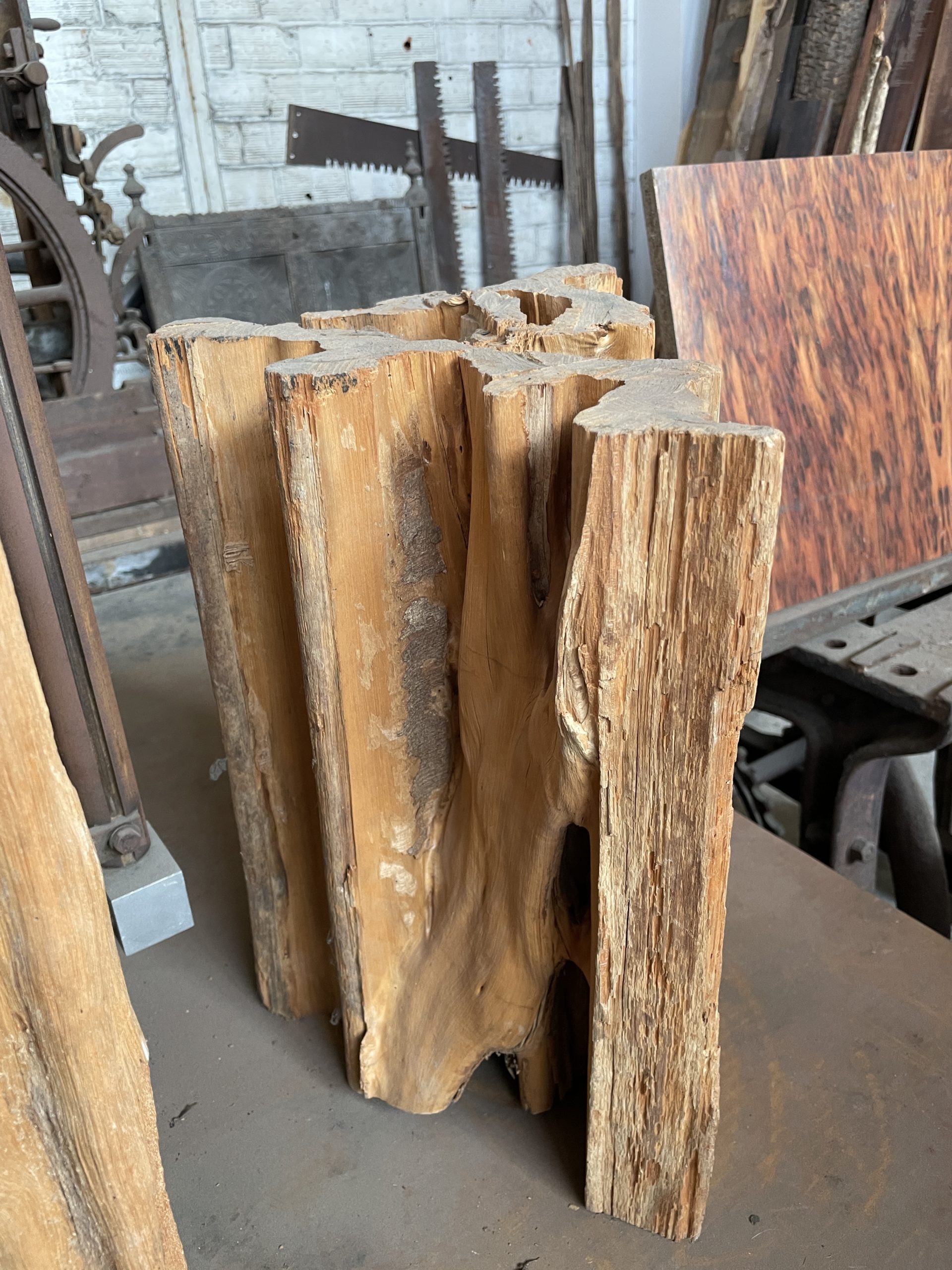 La scie au bois montant se dresse dans l’atelier comme une présence ancienne. Sa lame va et vient, inlassablement, tandis que le tronc, lourd et majestueux, s’élève lentement vers elle. Le bois monte, la lame scie: un mouvement régulier, presque hypnotique, semblable au souffle d’un être vivant. Rien n’y est forcé. Chaque va-et-vient prélève une feuille fine, une peau d’arbre intacte. La fibre n’est pas brisée, mais révélée. Alors apparaissent les veines, les contrastes, les dessins secrets de l’arbre. Dans cette rencontre lente et patiente, la machine et le bois semblent dialoguer encore, comme si l’arbre continuait à respirer dans le geste de l’artisan.